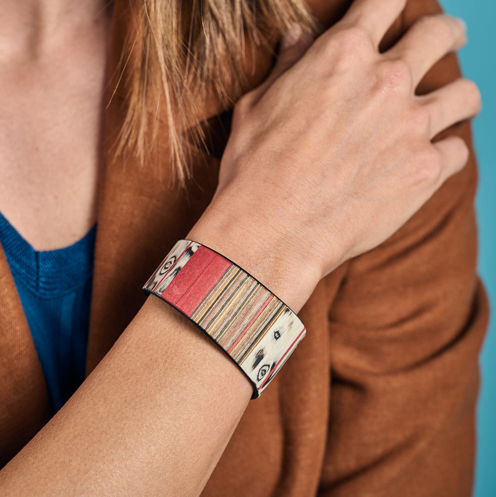 This one-of-a-kind cuff is made from reclaimed wood, making it environmentally friendly and stylish. The colorful design is unique and fun, and each cuff is different, so you know you're getting a truly one-of-a-kind piece.